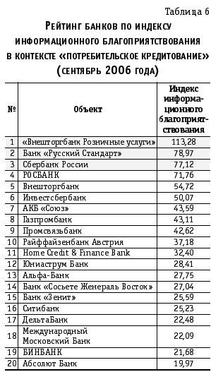 Например, если вы сравните информационных лидеров сегмента «потребительское кредитование» за сентябрь 2006 года (табл. 4), то обнаружите, что банк «Русский Стандарт», уступая Сбербанку по общему числу сообщений, почти в два раза опережает его по числу материалов, в которых компания является главным объектом повествования. Положительных публикаций о «Русском Стандарте» (как и цитат его представителей) также больше, нежели о Сбербанке (то есть процент позитивных публикаций выше), но и негативных статей больше втрое. При этом Внешторгбанк, занимая третье место, в главной роли представлен чаще, чем абсолютный лидер, от негатива полностью избавлен (хотя и позитивом не перегружен), а в пересказе прямая речь его представителей встречается опять же чаще, чем ссылки на высказывания сотрудников Сбербанка.