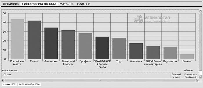 Только 20–25% российских потребителей готовы доверить свои сбережения отечественным банкам — таковы результаты последних исследований потребительской аудитории. Для банка, в чьи планы входит покорение розничного рынка, это означает необходимость маркетинговых и PR-мероприятий, направленных на формирование положительного имиджа в глазах целевой аудитории. При этом аргументы, убедительные для профессионалов, — валюта баланса, чистые активы, инвестиционные рейтинги и другие показатели деятельности банка — населению зачастую просто непонятны. Гораздо более важную роль играет освещение деятельности банка в средствах массовой информации — сведения, понятные большинству потребителей. Это новости, которые аудитория ежедневно узнает из газет и журналов, интернет-изданий, телевидения и радио, из лент информационных агентств, — новости, которые активно обсуждают с друзьями, коллегами и знакомыми. А знаете ли вы, что именно изо дня в день в течение недели или года сообщают о вас, вашей компании, ваших брендах масс-медиа?